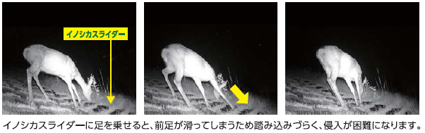 滑りやすい表面形状により、イノシシやシカなど蹄を持つ偶蹄目の動物の侵入を抑制します。