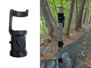 ブルーキングワイヤーと強度の高い支柱、そして単管碍子を組み合わせることで、クマの突進等による衝撃に負けない強度の高い電気柵が完成します。