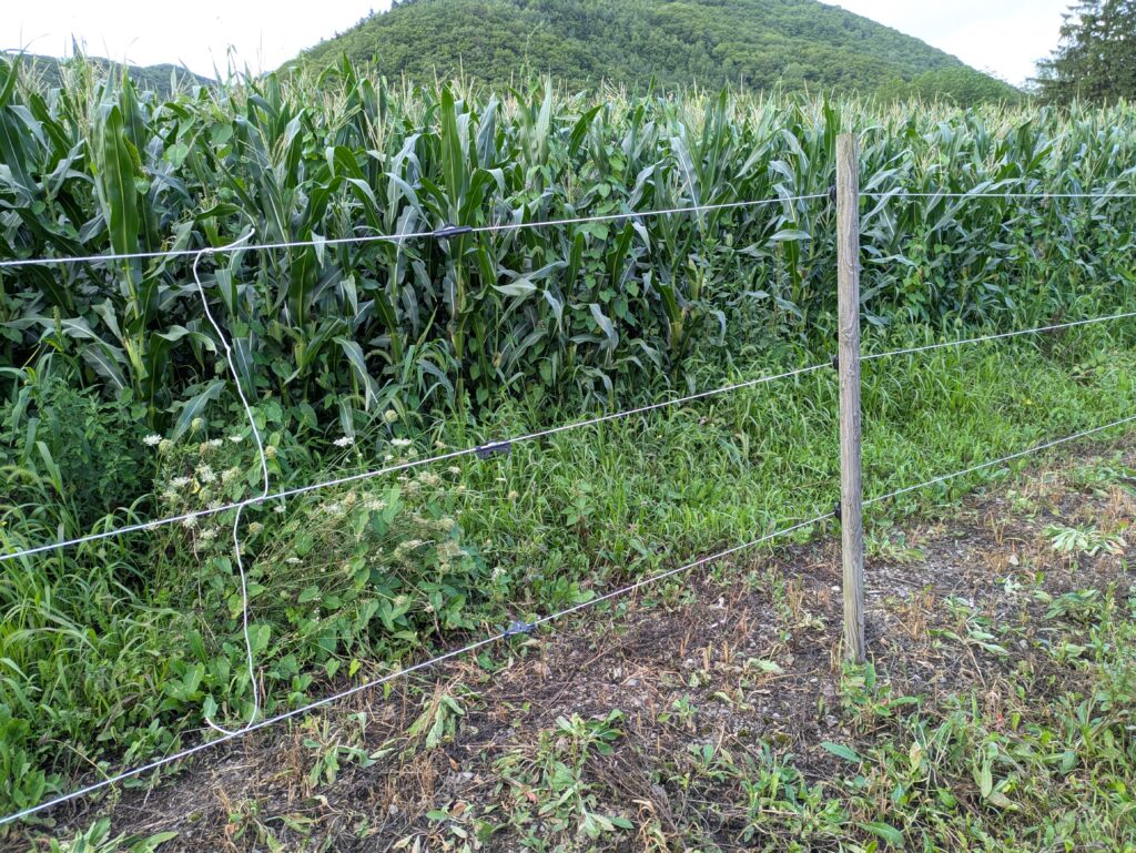 左の写真はクマもシカもいる場所でデントコーン畑の周囲に設置された電気柵で、1.3mほどの高さに3段張ってありました。シカ対策としては、できれば4~5段にしたほうが良いと思いますが、これで対応できているのであれば不適切とは言えません。